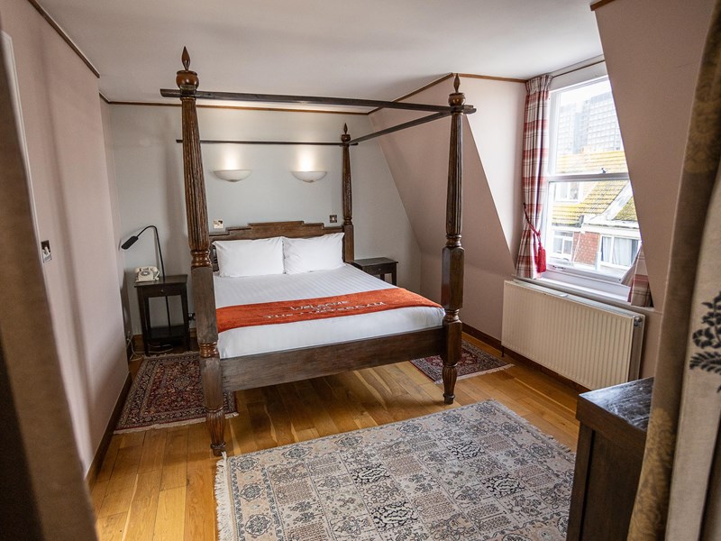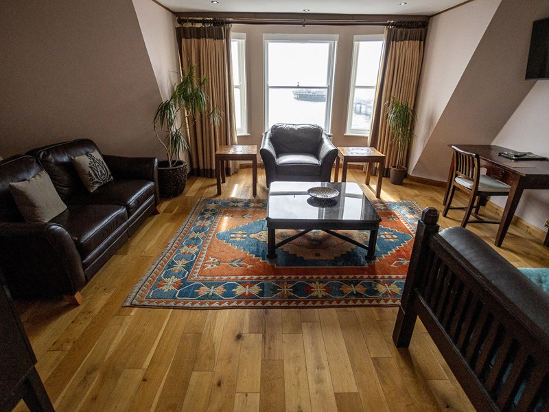 This luxurious suite offers breathtaking panoramic views of Brighton's seafront. It includes a beautifully appointed living room with a day bed, a sleek executive bathroom, and a separate bedroom featuring a grand super king-size four-poster bed with a canopy. The suite is furnished with elegant leather furniture and equipped with large LCD flat-screen TVs in both the bedroom and the living room. Additional amenities include a spacious living area with sofas, a hairdryer, a bath and shower, an ironing board, and tea/coffee-making facilities. Enjoy the stunning sea view from this exquisite suite!